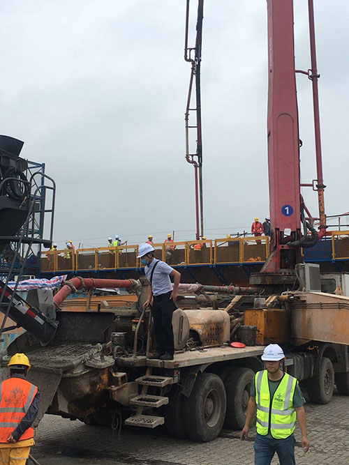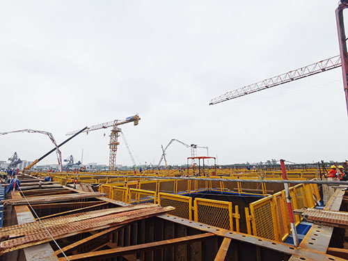 南京仙新路过江通道是南京“高快速路系统”的重要组成部分,预计2024年建成通车。主桥采用主跨1760m的单跨门型塔整体钢箱梁悬索桥结构,跨径目前在同类桥型中居国内第一、世界第二。该工程采用我公司新型聚羧酸系高性能减水剂。 6月22日上午9时许,在鞭炮齐鸣声中,中交二公局南京仙新路过江通道A4标北锚碇沉井首次浇筑正式拉开帷幕。沉井基础长70m、宽50m、高50m,沉井基础划分为9层接高完成施工,第一层8m为钢壳混凝土,第二至第九层42m为钢筋混凝土,共分为20个“井”孔进行施工。采用我公司新型分时段保坍型HLC-IX聚羧酸系高性能减水剂,实现了该项目高温环境混凝土2h坍落度损失小于20mm、优良的泵送性能以及初凝时间大于24h等技术要求。经过53小时的连续施工,首件浇筑顺利完成,混凝土共计浇筑约6400 m3。 主桥北锚碇第一次钢壳混凝土的顺利浇筑为后续锚体施工打下坚实基础。这是我公司又一次参建的跨江大桥之一,不久的将来,一桥飞架南北,天堑变通途。公司将继续以优质的产品和高效的服务为该工程提供有力支撑。